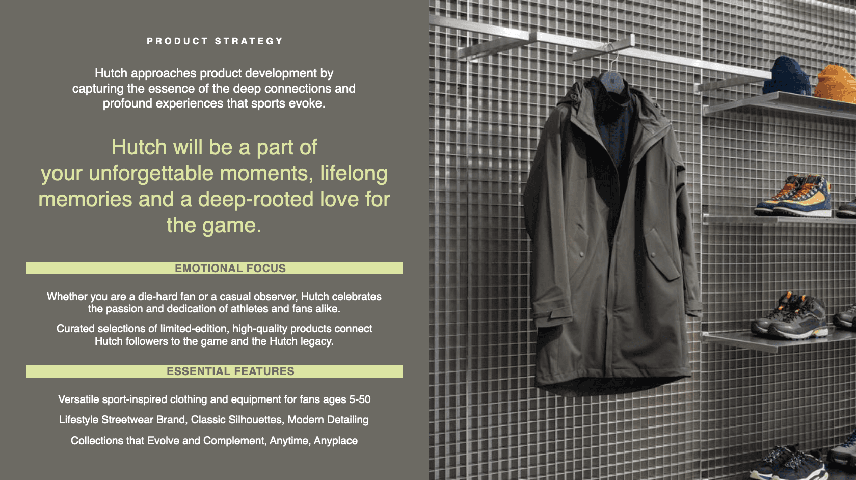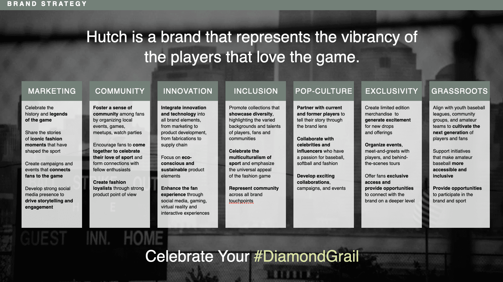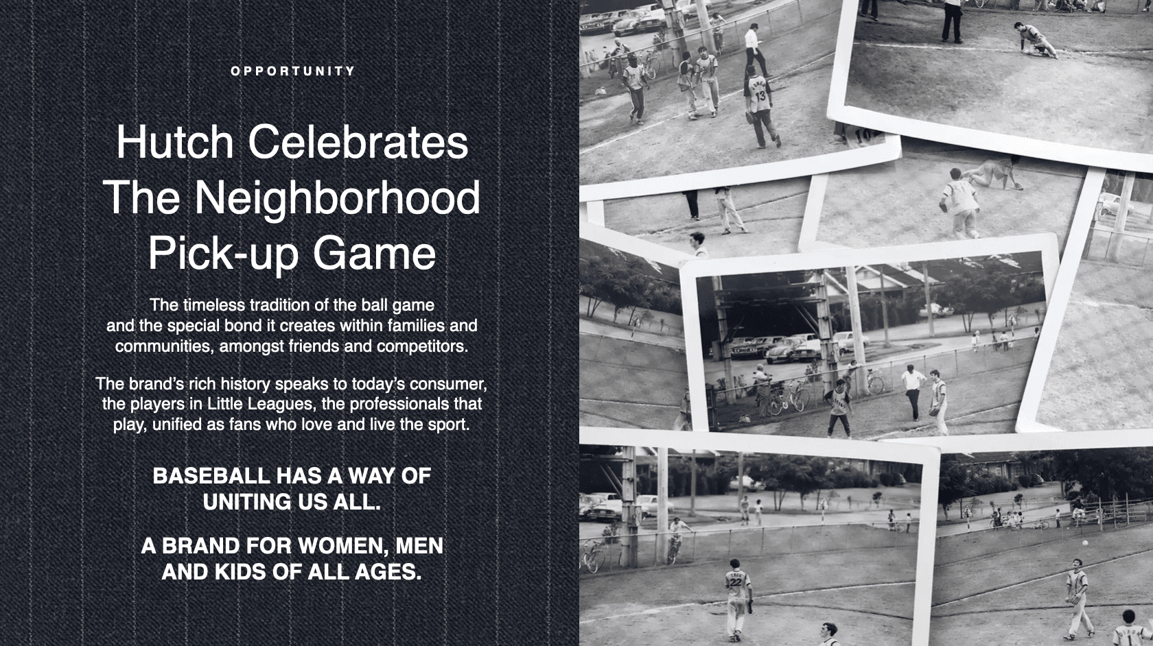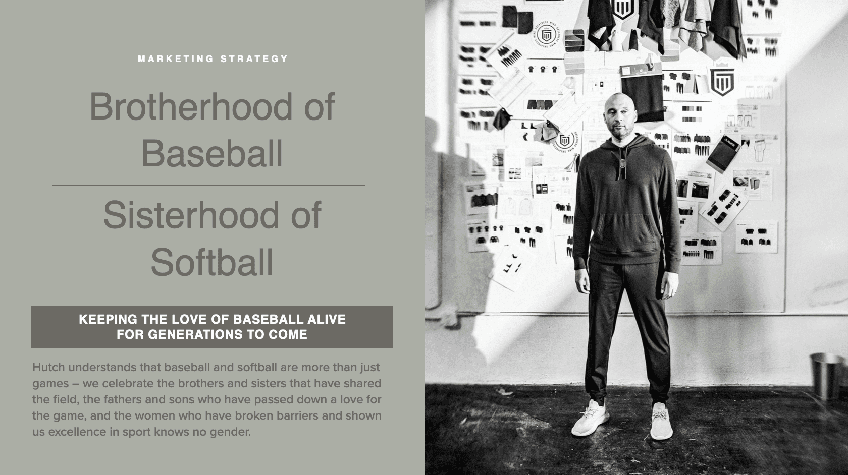 I developed this brand deck while working with Hutch as the brand explores a strategic pivot, expanding its identity beyond contemporary sportswear into a more culturally rooted lifestyle and streetwear brand. The deck repositions Hutch around sport as a unifying force, drawing from baseball’s legacy, community, and everyday pickup culture, to strengthen its narrative, deepen authenticity, and build long-term cultural relevance. It outlines a refreshed brand vision, target consumer, product direction, and partnership strategy, proposing a path for Hutch to evolve while staying grounded in sport, craftsmanship, and lived experience.