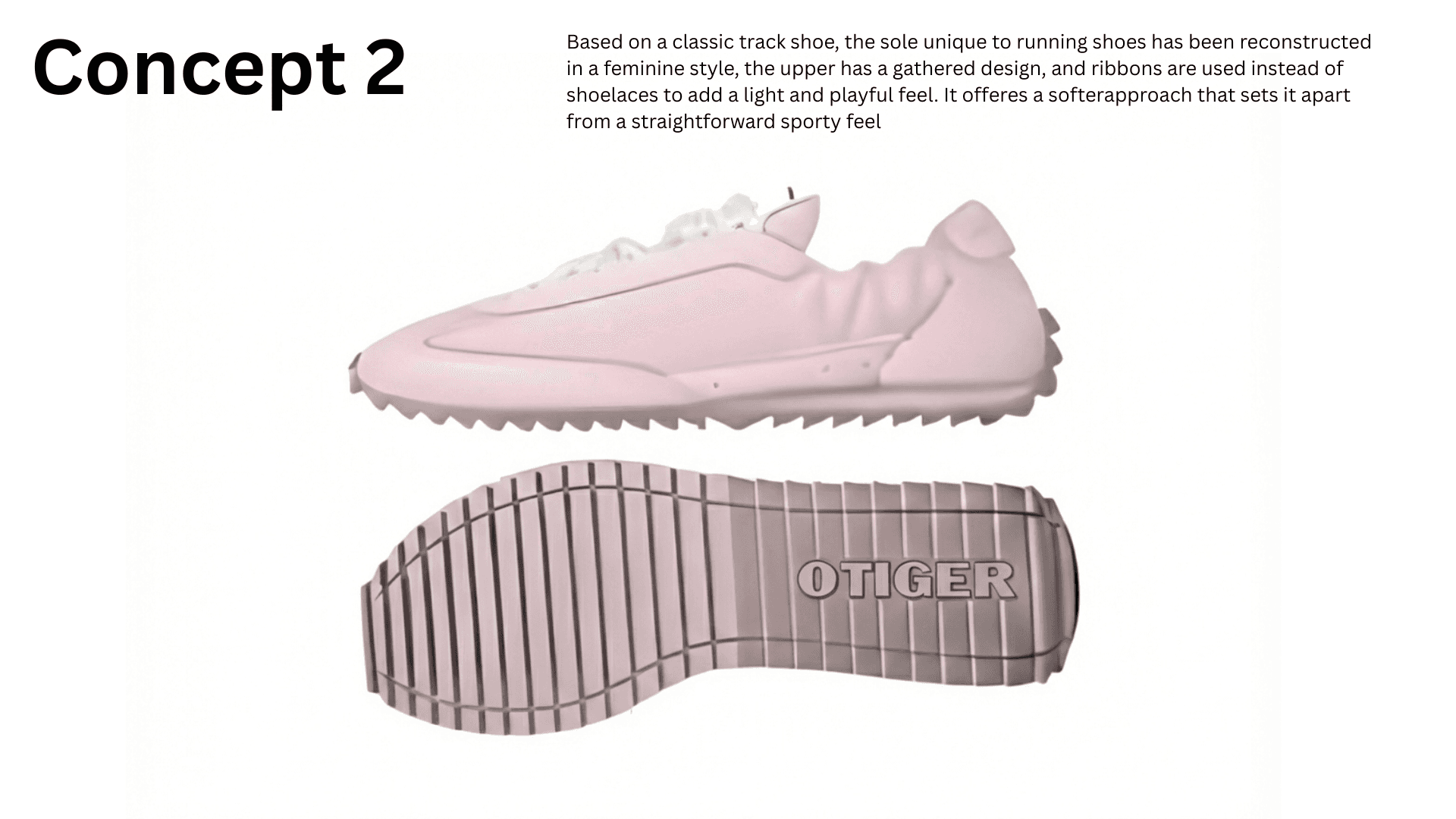 O TIGER is a women-focused line currently in development at Onitsuka Tiger. I explored trend, color, and form to reinterpret the brand’s design language into a softer lifestyle sneaker concept.